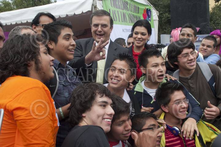 MÉXICO, D.F., 14FEBRERO2012.- Marcelo Ebrard Casaubón, jefe de Gobierno local, y su esposa Rosalinda Bueso, se tomaron la foto con algunos jóvenes durante la feria del Amor y la Amistad que se realizó en el Monumento de la Revolución. FOTO: ISAAC ESQUIVEL/CUARTOSCURO.COM