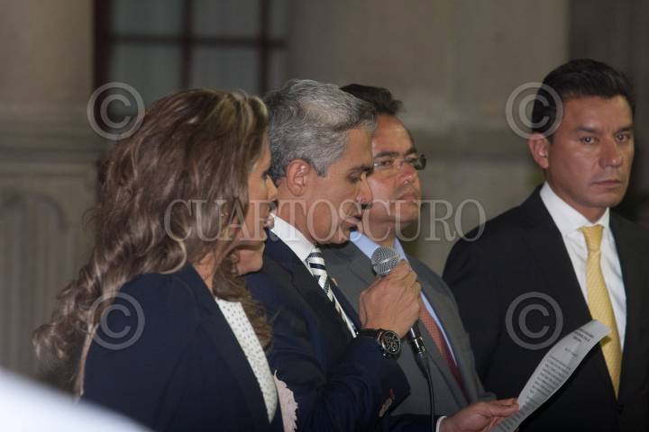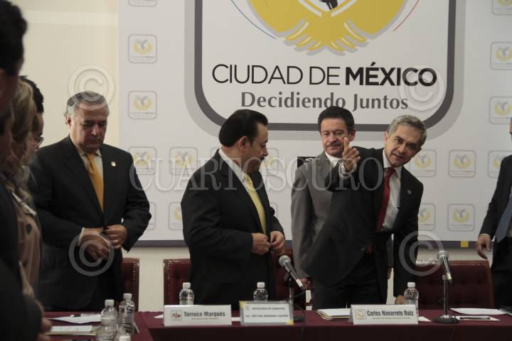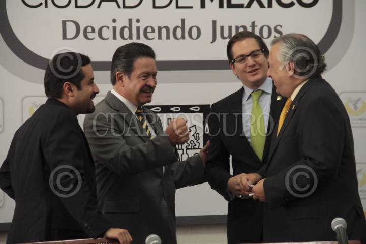MÉXICO, D.F., 18JULIO2013.- Carlos Navarrete, secretario del Trabajo, Leticia Quezada, jefea delegacional de la Magdalena Contreras, Salomón Chertorivski, secretario de Desarrollo Económico, Alejandro Fernández, jefe delegacional de Cuauhtémoc, y Héctor Serrano, secretario de Gobierno, durante la Firma del Convenio de Colaboración entre las 16 delegaciones y la Secretaría del Trabajo del DF con el que se llevaran a cabo acciones para emplear a jóvenes. Dentro de esos acuerdos se encuentra la "Expo-Empleo para Jóvenes. Vive y Trabaja en tu Delegación", que dió inicio hoy en el Zócalo. FOTO: JUAN PABLO ZAMORA /CUARTOSCURO.COM