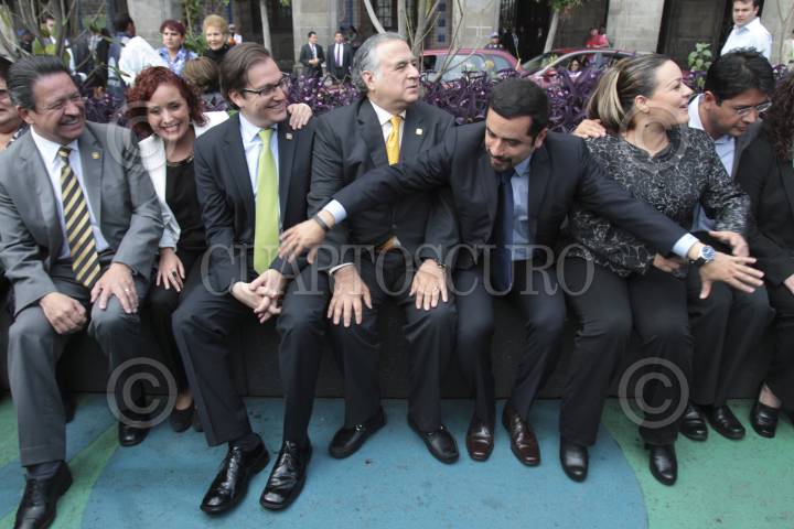 MÉXICO, D.F., 18JULIO2013.- Carlos Navarrete, secretario del Trabajo, María Fernanda Olvera, directora del Instituto de la Juventud del DF, Salomón Chertorivski, secretario de Desarrollo Económico, Miguel Torruco, secretario de Turismo, Víctor Hugo Romo, jefe delegacional de Miguel Hidalgo, Elizabeth Mateos, jefa delegacional del Iztacalco, y Alejandro Fernández, jefe delegacional de Cuauhtémoc, se tomaron la foto en una banca del parque de bolsillo ubicado en el Zócalo, esto después de la ceremonia en la que se firmó un Convenio de Colaboración entre las 16 delegaciones y la Secretaría del Trabajo del DF con el que se llevaran a cabo acciones para emplear a jóvenes. FOTO: JUAN PABLO ZAMORA /CUARTOSCURO.COM
