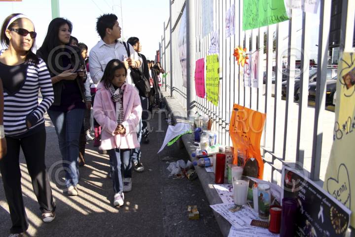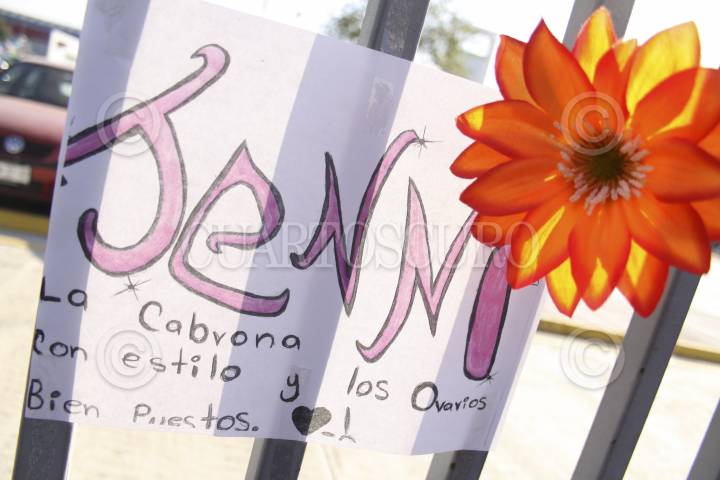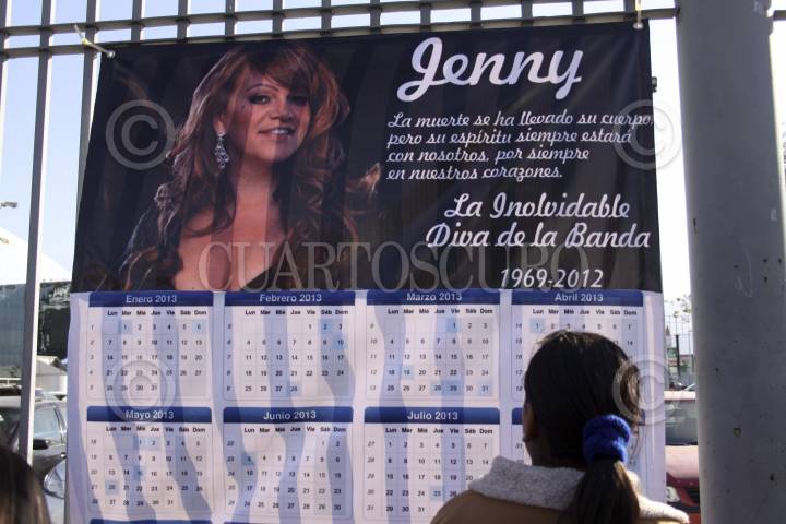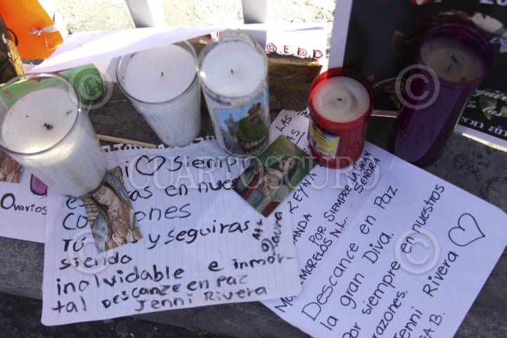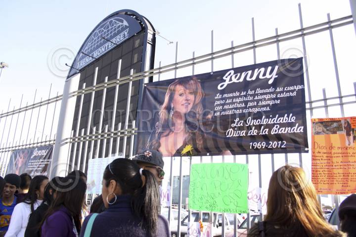 MONTERREY, NUEVO LEÓN, 11DICIEMBRE2012.- Veladoras, fotografías y pancartas fueron colocadas a un costado de la Arena Monterrey como muestras de afecto de admiradores de Jenni Rivera, en este lugar la diva ofreció su última presentación musical. Además comerciantes mantienen la venta de camisetas y accesorios con la imagen de la artista. FOTO: GABRIELA PÉREZ MONTIEL /CUARTOSCURO.COM