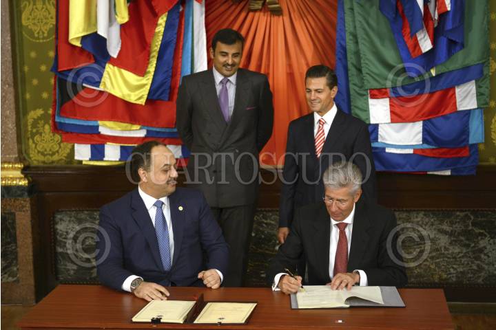 MÉXICO, D.F., 24NOVIEMBRE2015.- En el Salón Embajadores del Palacio Nacional, el Presidente Enrique Peña Nieto y Su Alteza Jeque Tamim bin Hamad Al Thani, Emir del Estado de Qatar, quien realiza una Visita Oficial a México, presidieron una reunión con sus respectivas comitivas en la que se revisaron los diferentes temas de la relación entre ambas naciones, con el objeto de fortalecer sus vínculos. FOTO: PRESIDENCIA /CUARTOSCURO.COM