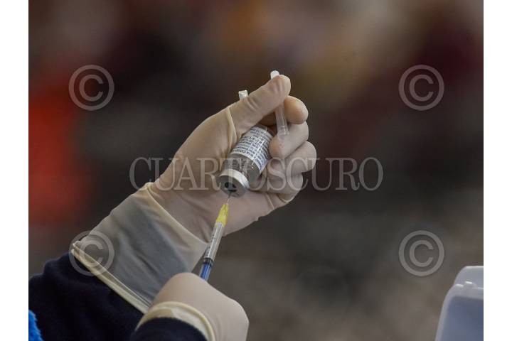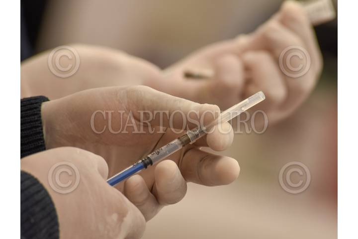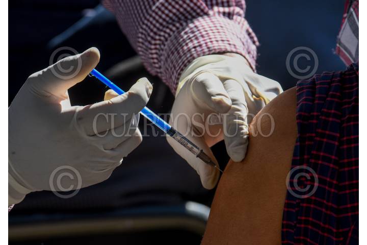 Un enfermero muestra la jeringa con la vacuna contra el Covid-19, antes de ser aplicada a un adulto mayor.