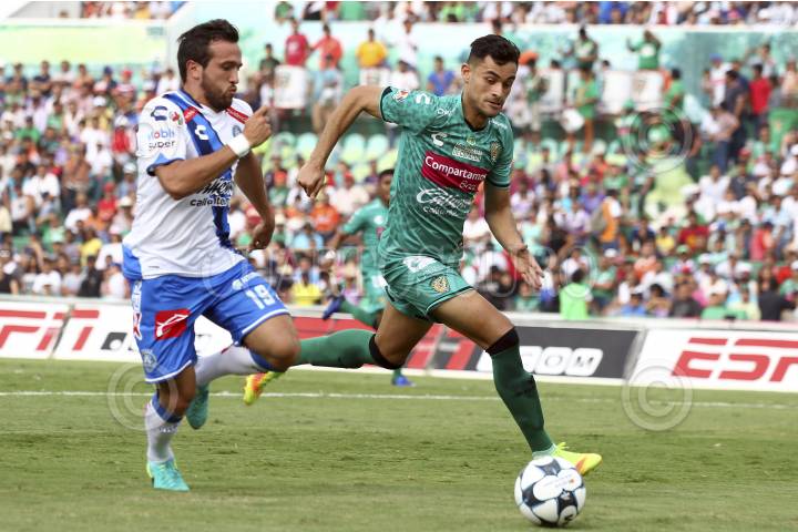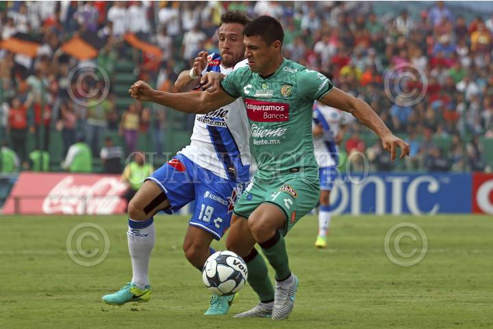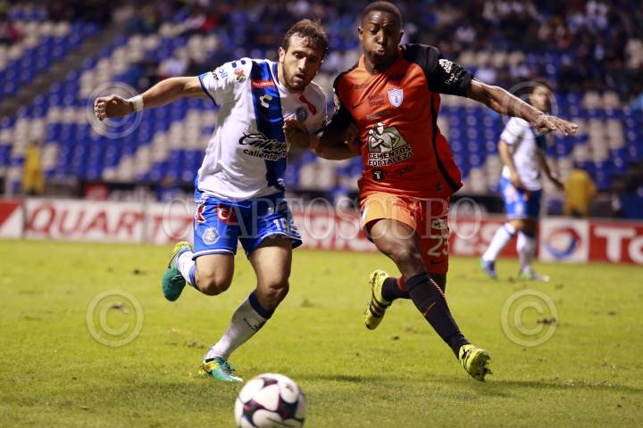 PUEBLA, 02OCTUBRE2016.- Los jugadores Jerónimo Amione del Puebla y Emmanuel García del Pachuca pelean el balón durante jugada del partido empatado 1-1 entre el Club Puebla y el Club Pachuca correspondiente a la jornada 12 del torneo apertura 2016 de la liga MX celebrado en el estadio Cuauhtémoc. FOTO: HILDA RÍOS/CUARTOSCURO.COM