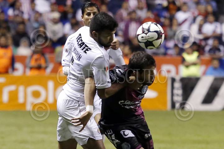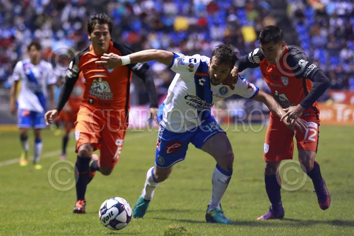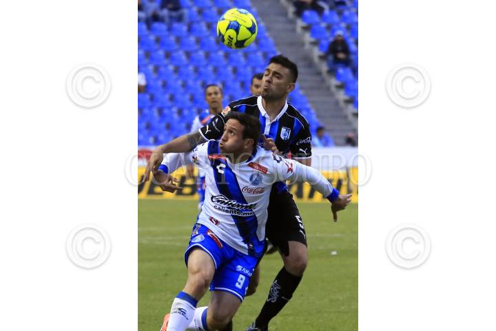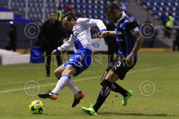 PUEBLA, PUEBLA, 22ENERO2017.- El jugador Jerónimo Amione, disputa el balón con MIguel Martínez en el juego entre el Club Puebla y los Gallos Blancos de Querétaro correspondiente a la jornada 3 del Torneo de Clausura de la Liga MX celebrado en el estadio Cuauhtémoc. FOTO: HILDA RÍOS / CUARTOSCURO.COM