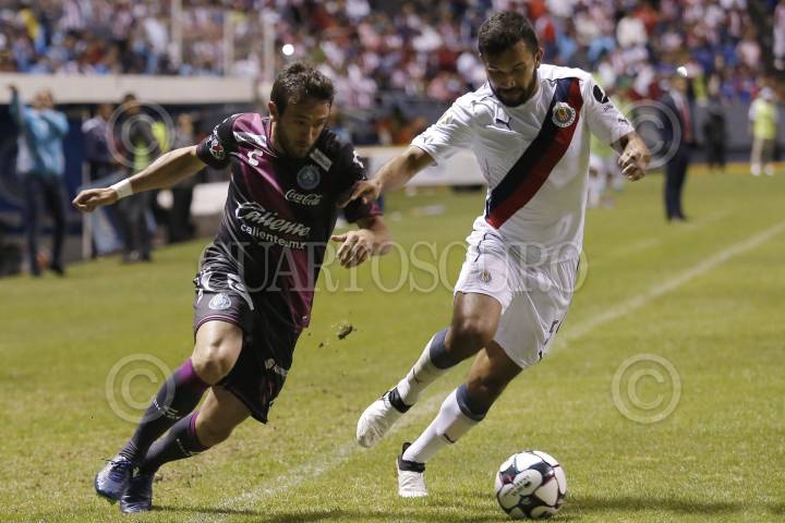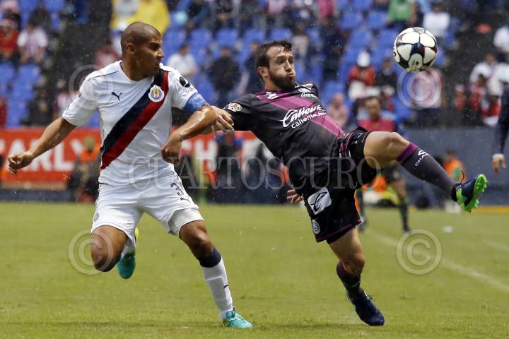 PUEBLA, PUEBLA, 16OCTUBRE2016.- Los jugadores Carlos Salcido y Jerónimo Amione durante jugada del partido correspondiente a la jornada 13 del torneo de Apertura MX entre el Club Puebla y las Chivas de Guadalajara con marcador final 0-2, celebrado en el estadio Cuauhtémoc. FOTO: HILDA RÍOS /CUARTOSCURO.COM