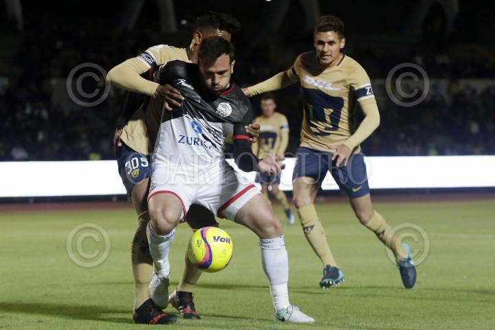 PUEBLA, PUEBLA, 17ENERO2018.- Los jugadores Jerónimo Amione y José Robles disputan el balón durante jugada del partido entre Lobos BUAP y Pumas de la UNAM con marcador final 2-0 a favor de los locales en juego correspondiente a la jornada 2 de la Copa MX celebrado en el estadio Universitario de la BUAP. FOTO: HILDA RÍOS/CUARTOSCURO.COM