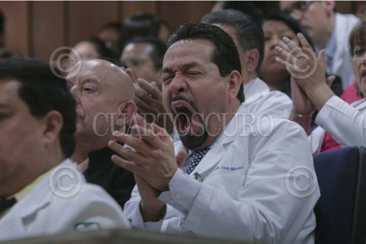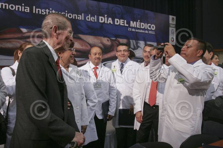 MÉXICO, D.F., 23OCTUBRE2012.- Médicos fueron homenajeados por el secretario de Salud, Salomón Chertorivski, y el director General del IMSS, Daniel Karam, Daniel Karam. También estuvo presente el médico Jesús Kumate Rodríguez, cuyo nombre lleva la medalla entregada como reconocimiento a los médicos destacados en el año. La ceremonia institucional del Día del Médico se llevó a cabo en el auditorio del Centro Médico siglo XXI. FOTO: JUAN PABLO ZAMORA /CUARTOSCURO.COM