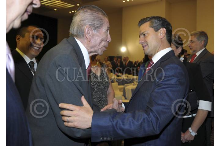 MÉXICO, D.F., 27JUNIO2013.- El Presidente Enrique Peña Nieto se pronunció hoy, durante la 32ª Asamblea General Ordinaria de Asociados de la Fundación Mexicana para la Salud, por impulsar, como lo establece el Plan Nacional de Desarrollo, una vigorosa política de prevención en salud, “que nos permita enfrentar los retos de las enfermedades crónicas no transmisibles como el cáncer, la diabetes o las enfermedades del corazón”. En la imagen el mandatario saluda a el doctor Jesús Kumate. FOTO: PRESIDENCIA /CUARTOSCURO.COM