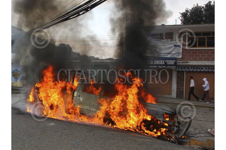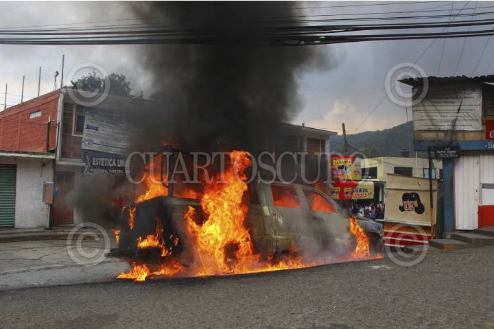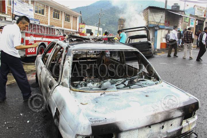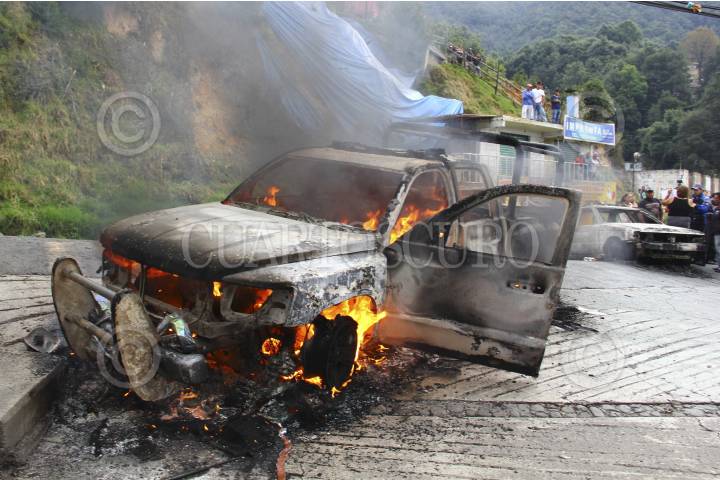 JILOTZINGO, ESTADO DE MÉXICO., 13MAYO2014.- Habitantes de San Luis Ayucan quemaron dos patrullas y mantuvieron retenidos a 10 policías municipales en la biblioteca pública de esta localidad, para exigir a las autoridades el rescate de una mujer, supuestamente secuestrada por guardias locales. FOTO: LUIS CARBALLO /CUARTOSCURO.COM