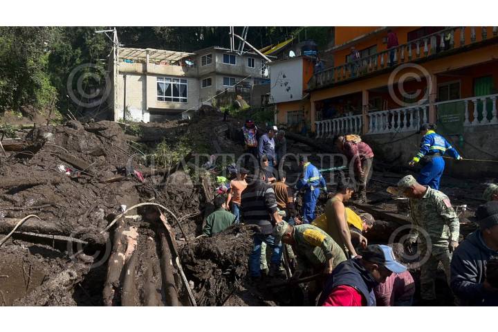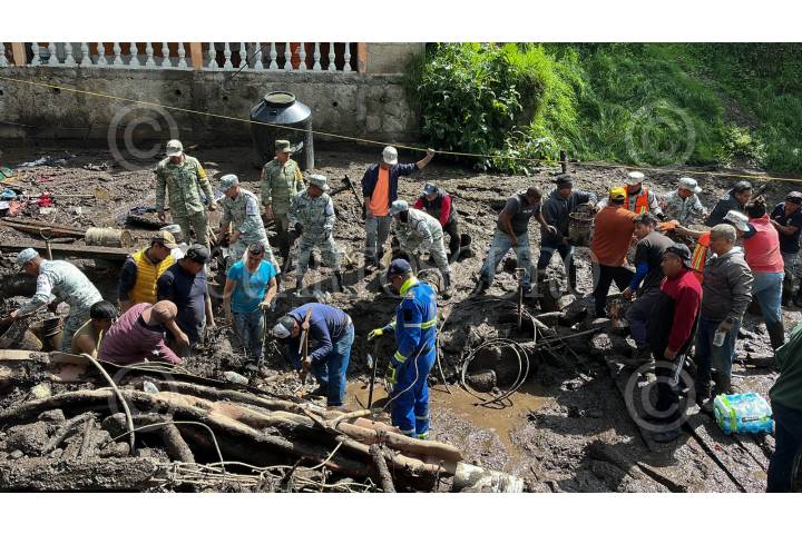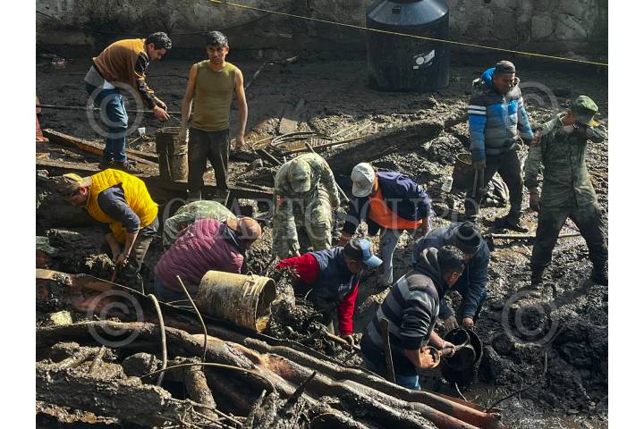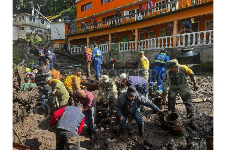 JILOTZINGO, ESTADO DE MÉXICO, 15SEPTIEMBRE2024.- Con motivo de las fuertes lluvias que provocaron el deslizamiento de tierra del cerro Las Palmas en la Colonia San Luis Ayucán, municipio de Jilotzingo, integrantes de la Guardia Nacional y del Ejército Mexicano activaron los Planes GN-A y DN-III-E con el fin apoyar a la población afectada. Las autoridades participantes coadyuvan con los trabajos en beneficio de la población, desplegando 62 efectivos de la Guardia Nacional y 90 del Ejército Mexicano, apoyados de organismos estatales y municipales, así como de dos binomios canófilos, todos realizando la remoción de lodo, escombros, además de labores de búsqueda y rescate. FOTO: SEDENA/CUARTOSCURO.COM