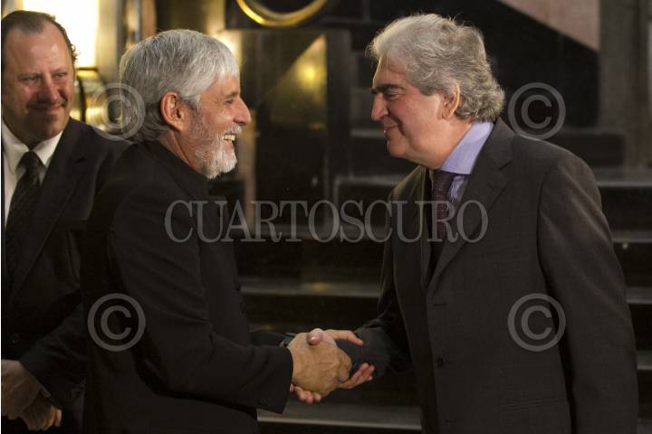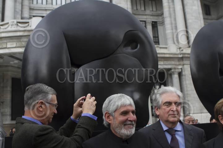 MÉXICO, D.F., 27NOVIEMBRE2015.- El escultor Jiménez Deredia y el presidente del Conaculta Rafael Tovar y de Teresa durante la inauguración de la exposición “Una génesis para la paz” del artista costarricense en la explanada de Bellas Artes. FOTO: MOISÉS PABLO /CUARTOSCURO.COM