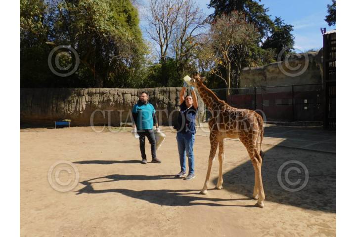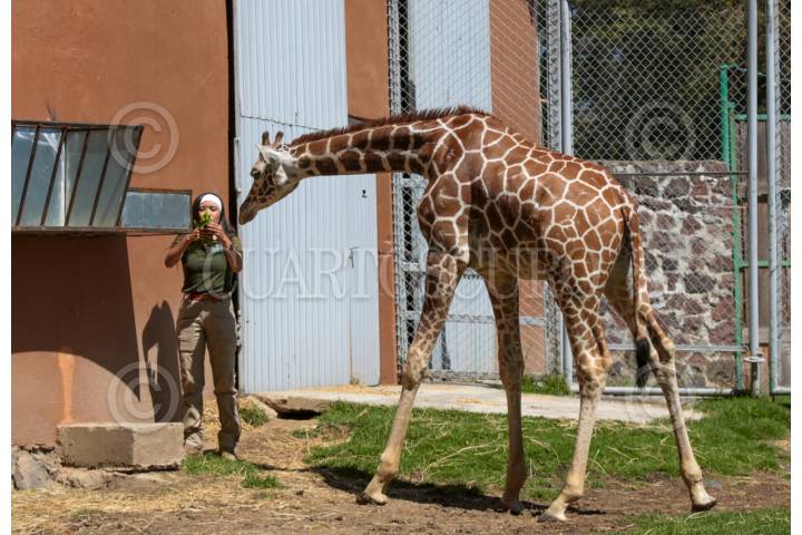 CIUDAD DE MÉXICO, 24ENERO2024.- De nueva cuenta, en el Centro de Conservación de la Fauna Silvestre de Chapultepec se desarrolla otra crianza artificial exitosa, conocida también como crianza con biberón o crianza a mano, de un bebé jirafa macho que es hijo de “Valentino”, el padre, y de “Sicaru”, la madre, por lo que la Secretaría del Medio Ambiente (Sedema) de la Ciudad de México invita a las y los capitalinos a elegirle nombre a este bello ejemplar. La jirafa no fue aceptada por su mamá pero gracias a la labor de médicos veterinarios, biólogos y cuidadores de animales se encuentra en buenas condiciones de salud y actualmente es alimentada con un biberón de becerro. Ahora, las y los capitalinos podrán ser parte de la historia de esta cría de jirafa, al votar por el nombre que más les agrade. FOTO: SEDEMA/CUARTOSCURO.COM