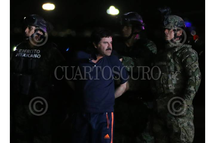 CIUDAD DE MÉXICO, 12FEBRERO2019.- Joaquín “El Chapo” Guzmán Loera ha sido declarado culpable de los 10 cargos criminales que le imputaban en una corte en Brooklyn, Nueva York, sentencia que le supondría purgar una cadena perpetua en una cárcel estadounidense, confirmación que se espera sea el próximo 25 de junio. El narcotraficante de 61 años escucho tranquilamente la sentencia de parte del juez Brian Cogan, en presencia de su esposa Emma Coronel. En la imagen durante su detención por parte de elementos de la Marina, el 08 de enero de 2016, en Los Mochis, Sinaloa. FOTO: ESPECIAL /CUARTOSCURO.COM