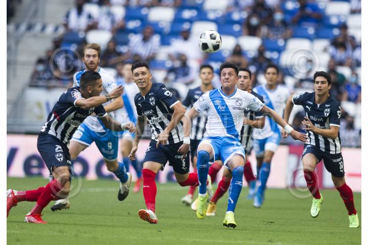 Claudio Kranevitter del equipo de los Rayados del Monterrey, se disputa el balón con Pablo Parra del equipo de Puebla, en el estadio BBVA Bancomer, partido correspondiente a la jornada 1 de la Liga Mx, Apertura 2021. Marcador Final: Monterrey: 1 - Puebla: 0