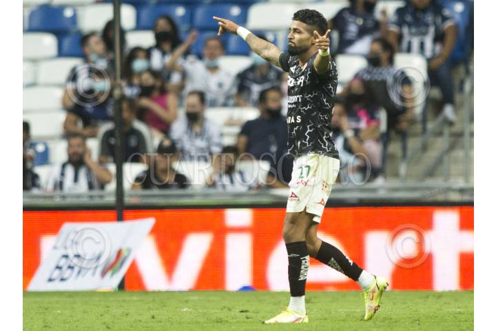 Rodirgo Aguirre del Necaxa, festeja el gol al minuto 100 en el estadio BBVA Bancomer, partido correspondiente a la jornada 15, de la Liga Mx, Apertura 2021. Marcador Final: Monterrey: 0 - Necaxa: 1
