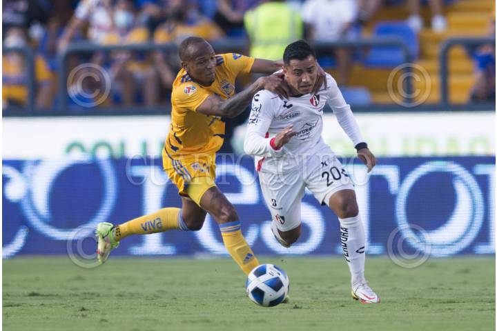 Luis Quiñones del equipo de los Tigres de la UANL, se disputa el balón con Ian Torres del Atlas, en el estadio Universitario, partido correspondiente a la jornada 7 de la Liga Mx, Apertura 2021. Marcador Final: Tigres: 1 - Atlas: 1