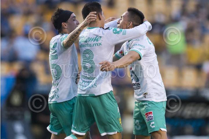 Jugadores del equipo del León, celebran el gol en el estadio Universitario, ante los Tigres, partido correspondiente a la jornada 8 de la Liga Mx, Apertura 2021. Marcador Final: Tigres: 2 - León: 2