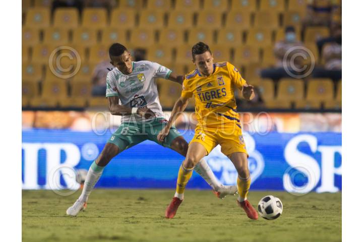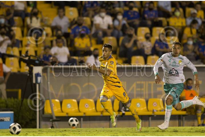 Florian Thauvin del equipo de los Tigres de la UANL, se disputa el balón con William Tesillo del León, en el estadio Universitario, partido correspondiente a la jornada 8 de la Liga Mx, Apertura 2021. Marcador Final: Tigres: 2 - León: 2