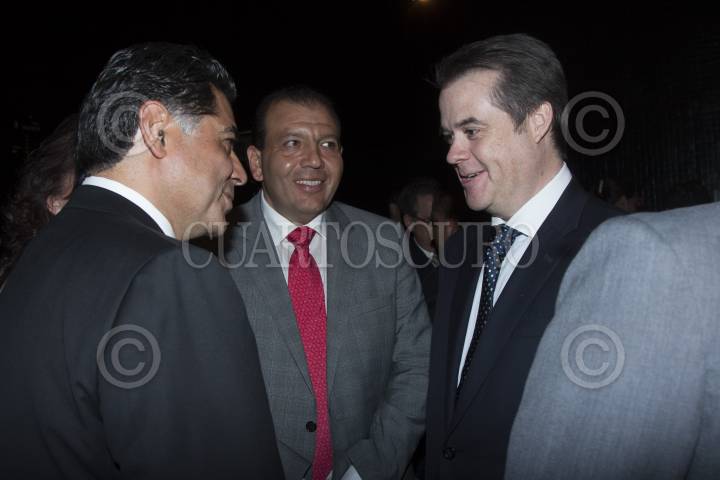 MÉXICO, D.F., 23ABRIL2013.- El Gobernador del Estado de Durango, Jorge Herrera, El Secretario de Turismo de Durango, Cristian Tame y Juan Domingo Beckmann, director de José Cuervo, dialógan, momentos antes de dar a conocer las actividades a realizarse en el estado por el 450 aniversario de la fundación de la capital. FOTO: FRANCISCO RODRÍGUEZ /CUARTOSCURO.COM