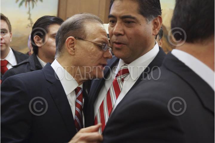 MÉXICO, D.F., 23ABRIL2013.- El Secretario de Turismo de Durango, Cristian Tame y El Gobernador del Estado de Durango, Jorge Herrera, momentos antes de dar a conocer las actividades a realizarse en el estado por el 450 aniversario de la fundación de la capital. FOTO: FRANCISCO RODRÍGUEZ /CUARTOSCURO.COM