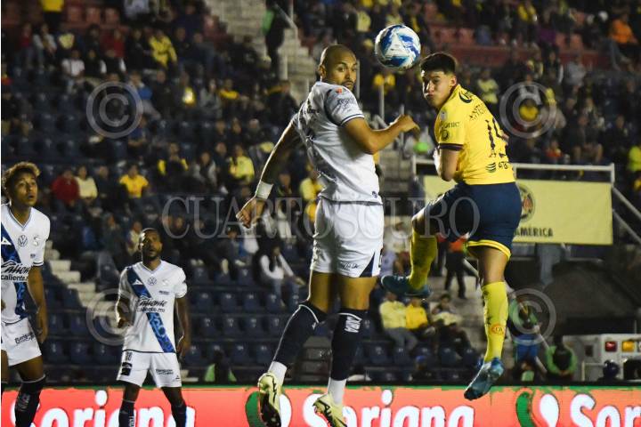 CIUDAD DE MÉXICO, 24AGOSTO2024.- Illian Hernández, delantero del América, remata el balón frente a la marca de Emanuel Lugarte, defensa del Puebla, durante el partido correspondiente a la jornada 5 del Torneo Apertura 2024 de la Liga MX llevado a cabo en el estadio Ciudad de los Deportes. FOTO: MARIO JASSO/CUARTOSCURO.COM