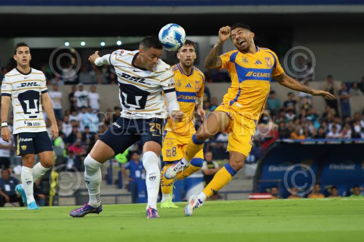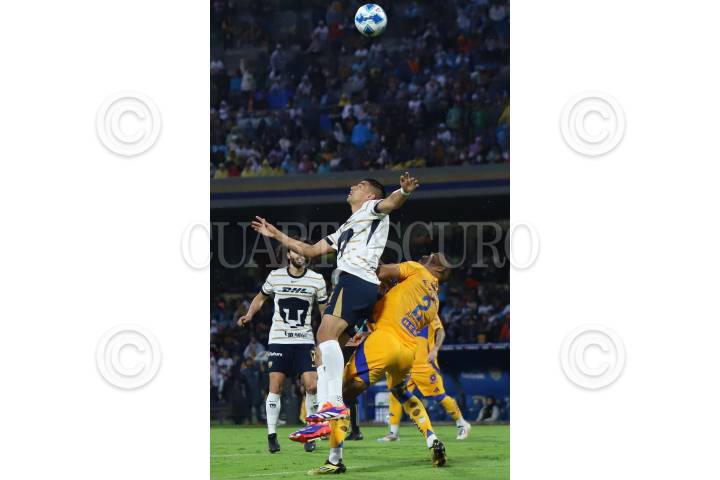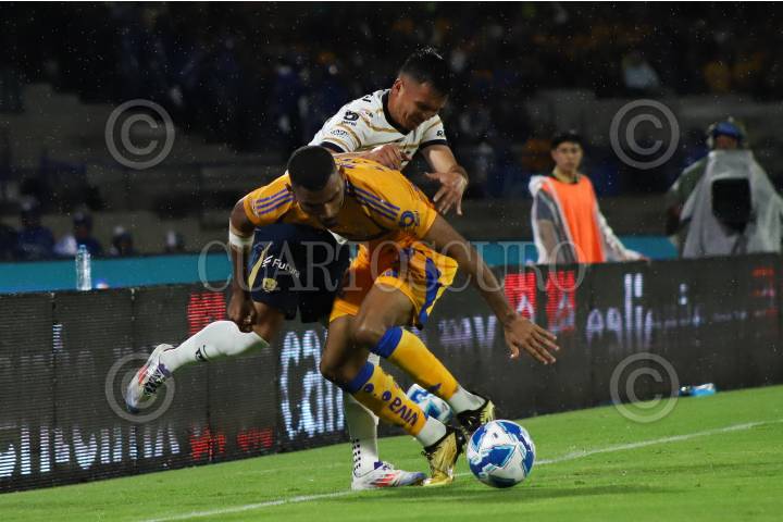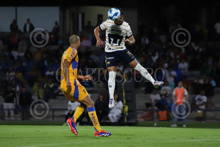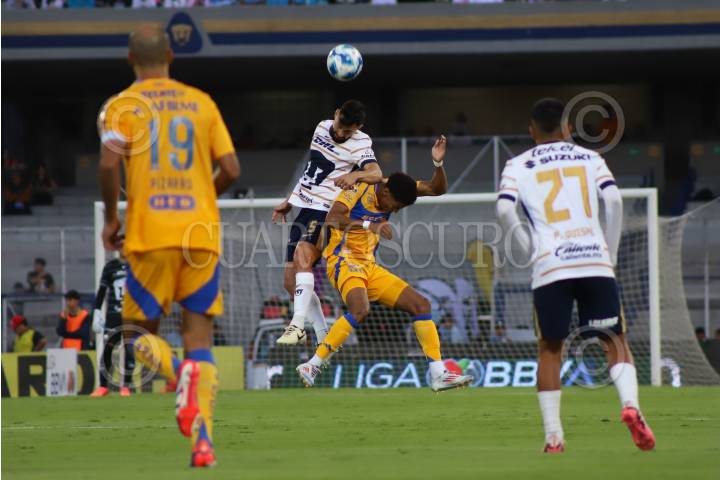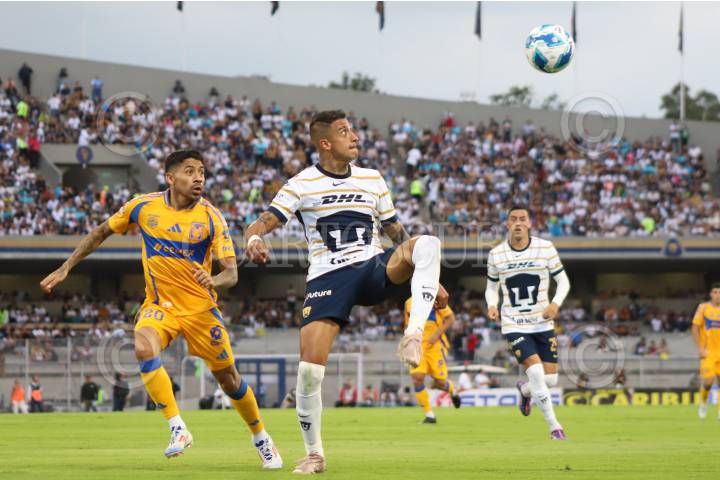 CIUDAD DE MÉXICO, 01SEPTIEMBRE2024.- Guillermo Martínez, delantero de Pumas, disputa el balón con el defensa de Tigres, Joaquim. FOTO: DANIEL AUGUSTO/ CUARTOSCURO.COM