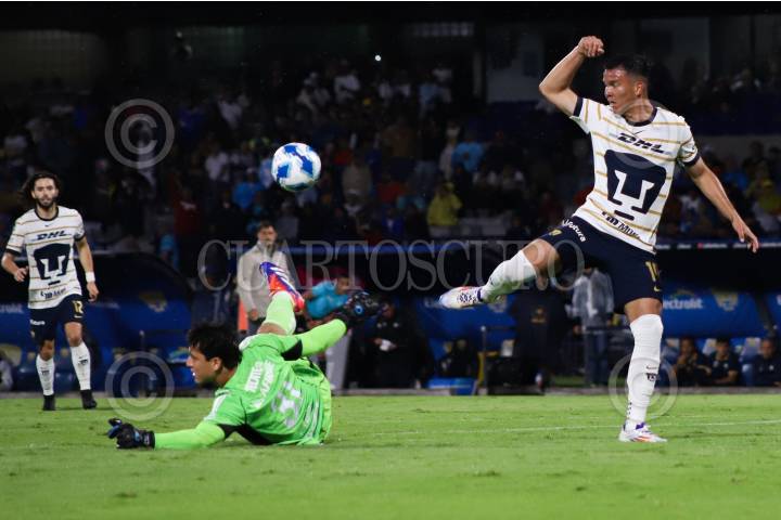 CIUDAD DE MÉXICO, 01SEPTIEMBRE2024.- Alí Ávila, delantero de Pumas, no logra disparar a puerta luego del error del portero de Tigres, Fernando Tapia. FOTO: DANIEL AUGUSTO/ CUARTOSCURO.COM