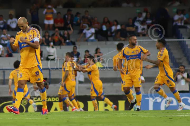CIUDAD DE MÉXICO, 01SEPTIEMBRE2024.- Los jugadores de Tigres festejan el segundo tanto de su equipo, el cual fue a cargo de Fernando Gorriarán. FOTO: DANIEL AUGUSTO/ CUARTOSCURO.COM