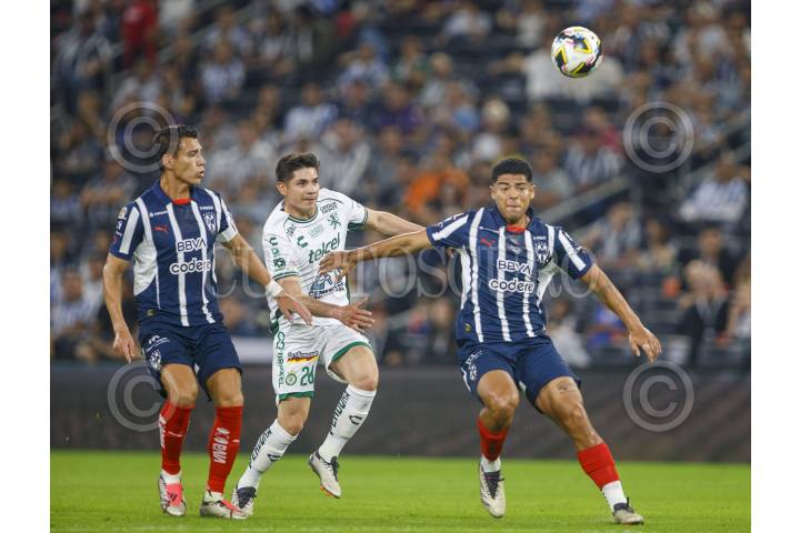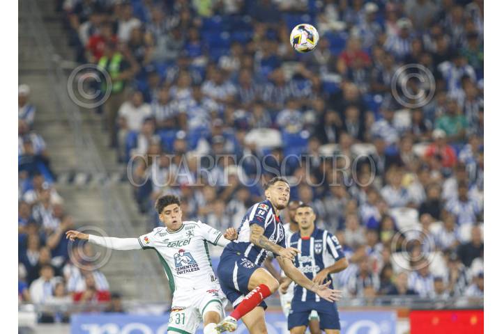GUADALUPE, NUEVO LEÓN, 10NOVIEMBRE2024.- Víctor Guzmán de los Rayados del Monterrey, se disputa el balón con Salvador Reyes del León, en el estadio BBVA, partido correspondiente a la jornada 17 de la Apertura 2024. Marcador Final: Monterrey: 2 - León: 1. FOTO: GABRIELA PÉREZ MONTIEL / CUARTOSCURO.COM