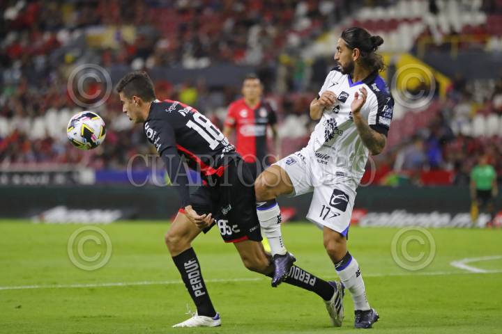 GUADALAJARA, JALISCO, 20SEPTIEMBRE2024.- Jugador de Atlas y Querétaro disputan el balón en el medio campo, esto en partido correspondiente a la jornada 9 del Torneo Apertura 2024 de la Liga MX, en donde se enfrentan los equipos de Atlas vs Querétaro, en juego que se lleva a cabo en el Estadio Jalisco, el marcador al final es de 1-0, a favor del equipo visitante. FOTO: FERNANDO CARRANZA GARCIA / CUARTOSCURO.COM