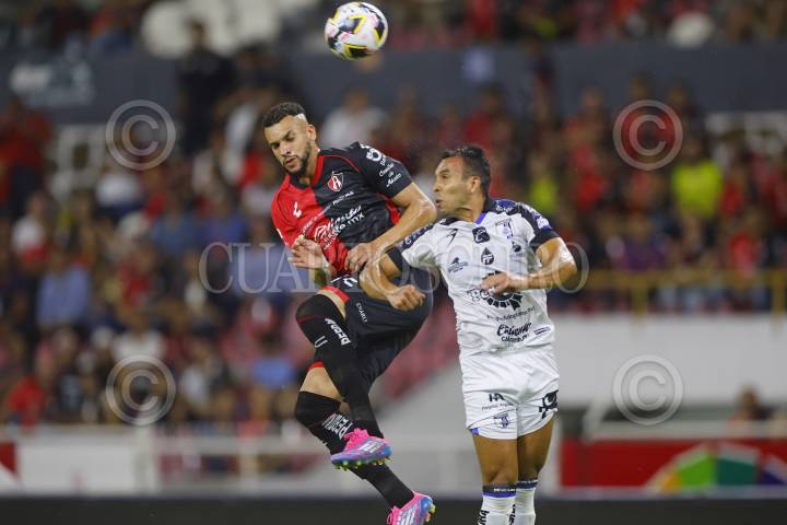 GUADALAJARA, JALISCO, 20SEPTIEMBRE2024.- Jhon Murillo jugador de Atlas disputa el balón con el contrario de Querétaro Jaime Gomez, esto en partido correspondiente a la jornada 9 del Torneo Apertura 2024 de la Liga MX, en donde se enfrentan los equipos de Atlas vs Querétaro, en juego que se lleva a cabo en el Estadio Jalisco, el marcador al final es de 1-0, a favor del equipo visitante. FOTO: FERNANDO CARRANZA GARCIA / CUARTOSCURO.COM