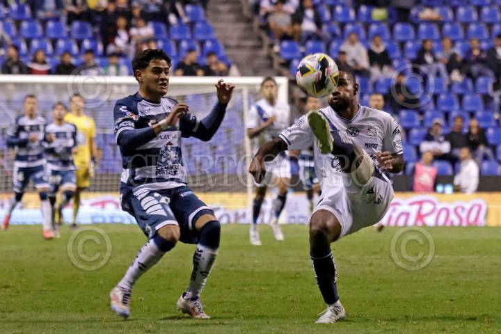 PUEBLA, PUEBLA, 20SEPTIEMBRE2024.- Santiago Ormeño y José Rondón durante el partido entre el Club Puebla y los los Tuzos del Pachuca, correspondiente a la jornada 9 del torneo Apertura 2024 de la Liga BBVA MX, celebrado en el Estadio Cuauhtémoc. FOTO: MIREYA NOVO/ CUARTOSCURO.COM