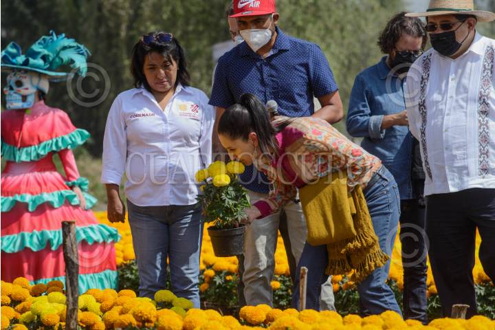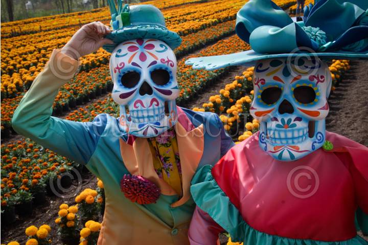 Dos catrinas posan para la fotografía en la zona Chinampera de Tlaxialtemalco, en Xochimilco.