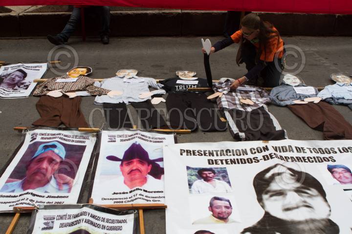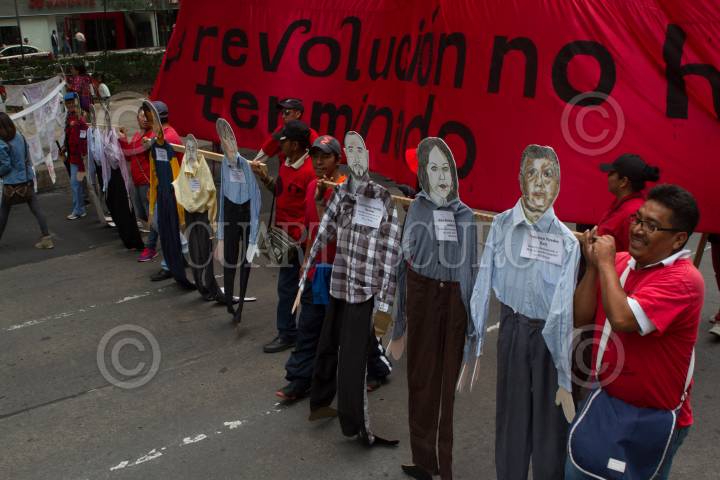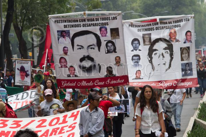 MÉXICO, D.F., 30MAYO2015.- Integrantes del Frente Nacional de Lucha por el Socialismo marcharon por la desaparición forzada de sus dirigentes Gabriel Alberto Cruz Sánchez y Edmundo Reyes Amaya. En el marco de la semana internacional del detenido desaparecido, distintas organizaciones populares y organismos defensores de los derechos humanos, participaron en una jornada de protesta y de denuncia para exigir al estado mexicano la presentación con vida a todos los detenidos desaparecidos en el país. También exigieron la presentación con vida de Teodulfo Torres Soriano, los indígenas triquis Daniela y Virginia Ortiz, el señor Lauro Juárez, Gabriel Gómez Caña, del defensor de derechos humanos Francisco Paredes Ruiz y los mas de 110 mil detenidos desaparecidos por el régimen. Los manifestantes partieron de la Secretaría de Gobernación rumbo a la PGR, ubicada en avenida Reforma. FOTO: MOISÉS PABLO /CUARTOSCURO.COM