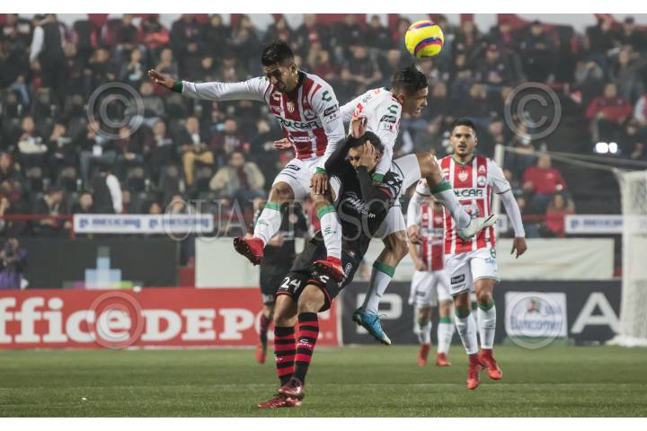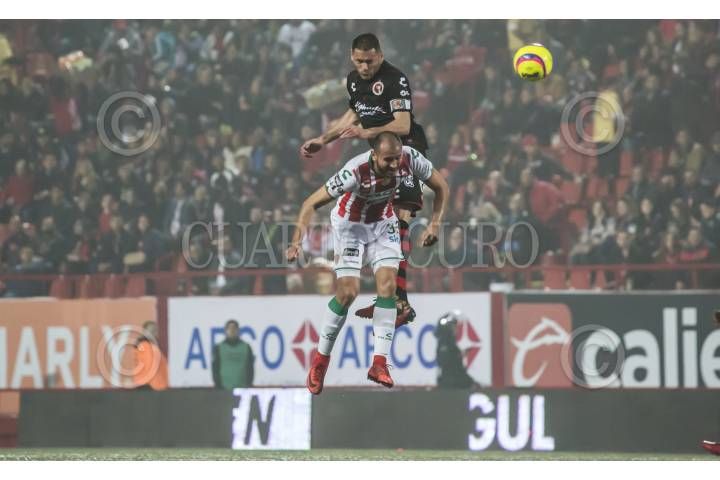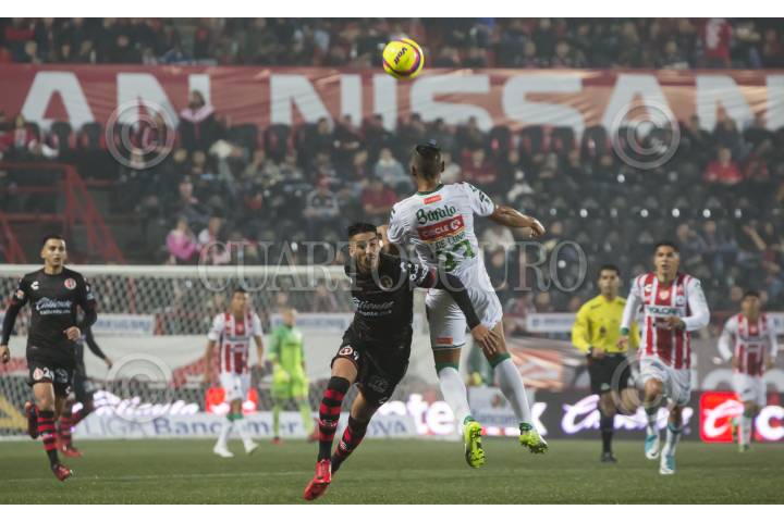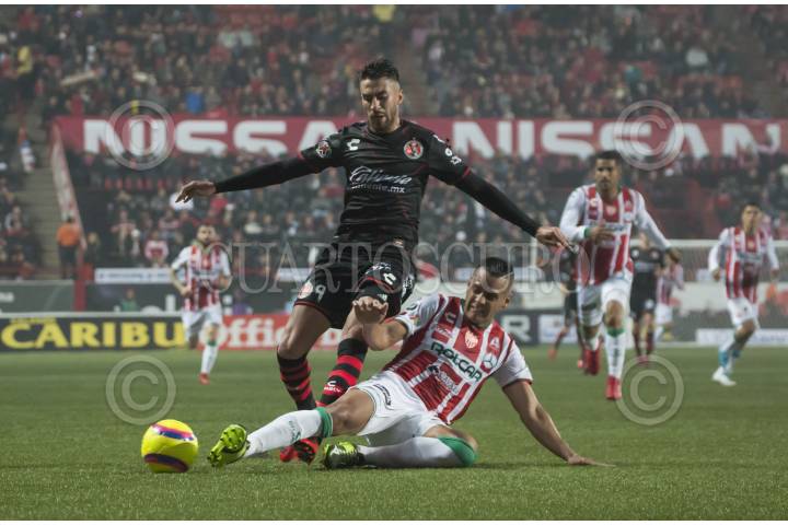 TIJUANA BAJA CALIFORNIA, 12ENERO2018.- Pablo Aguilar disputa la bola con Mario de Luna durante el partido entre Xoloitzcuintles de Tijuana contra Rayos de Necaxa realizado en el estadio Caliente, como parte de la jornada 2 del Torneo de Clausura 2018 de la Liga MX. FOTO: CUARTOSCURO.COM