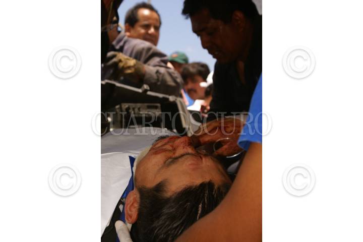 ATOTONILCO DE TULA, HIDALGO, 04AGOSTO2009.- Poco después de las 12 del día, se registró accidente en la carretera Tula-Jorobas, a la altura de la entrada de la comunidad de Bominthzá, luego de que una camioneta tipo Urvan perdiera el control y se fuera a impactar contra el semáforo, terminando sobre el camellón. Gerardo Aparicio Hernández, de 28 años de edad, quedó prensado en la unidad luego de pasarse la luz preventiva del semáforo y volantear cuando un tráiler iba a cruzar hacía la comunidad de Bominthzá. Junto con Gerardo Aparicio también viajaba Raymundo Carrera, ambos de Tecámac, Estado de México. Éste último resultó ileso. Casi dos horas tardaron los cuerpos de rescate en liberar al lesionado para trasladarlo a un hospital privado de la ciudad de Tula de Allende. La vialidad se vio ligeramente afectada por el percance. FOTO: FRANCISCO VILLEDA/CUARTOSCURO.COM