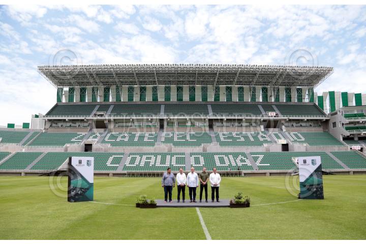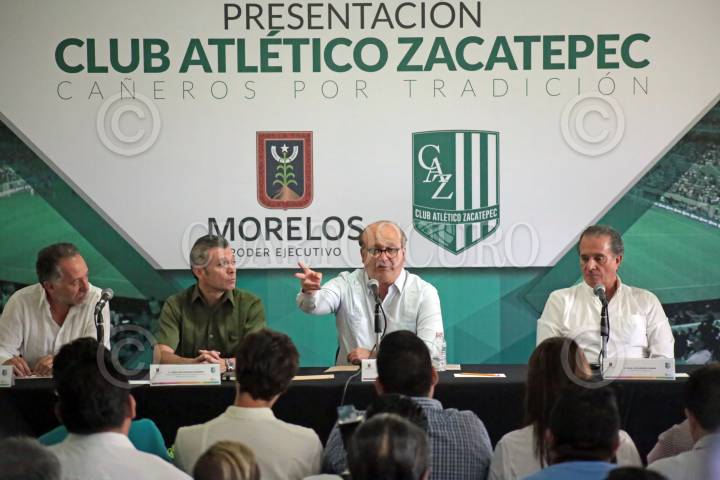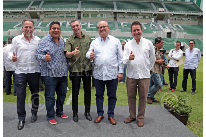 ZACATEPEC, MORELOS, 20JUNIO2017.- Esta tarde fue presentado en el estadio Agustín “Coruco” Díaz el Club Atlético Zacatepec. Su dueño, José Luis Higuera estuvo acompañado del gobernador de Morelos, Graco Ramírez Abreu, Víctor Manuel Arana Presidente del club y Raúl Orvañanos comentarista de futbol que jugo en el equipo cañero. La presentación ante la afición será el 15 de julio jugando contra los Pumas de la UNAM. FOTO: MARGARITO PÉREZ RETANA /CUARTOSCURO.COM
