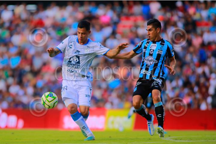 Roberto de la Rosa del Pachuca y José Maduena del Querétaro durante el partido de la jornada 17 del Torneo Clausura 2023 de la Liga MX, en el estadio Corregidora.