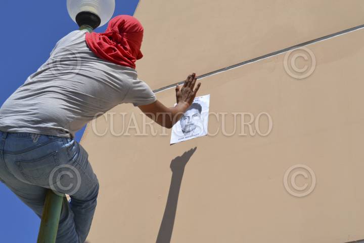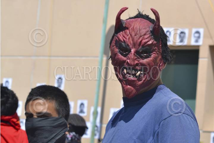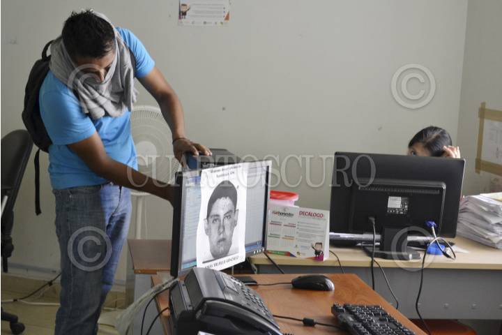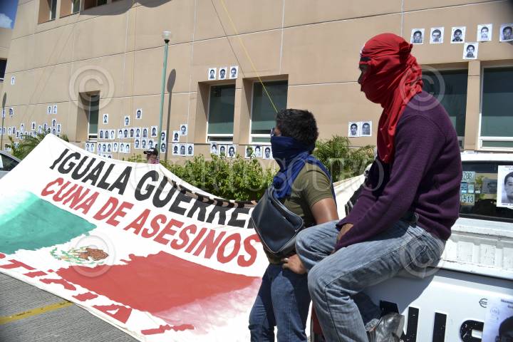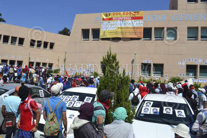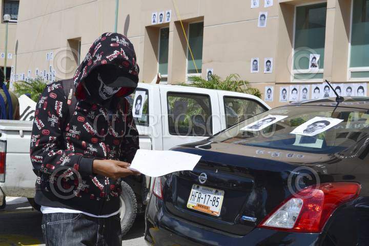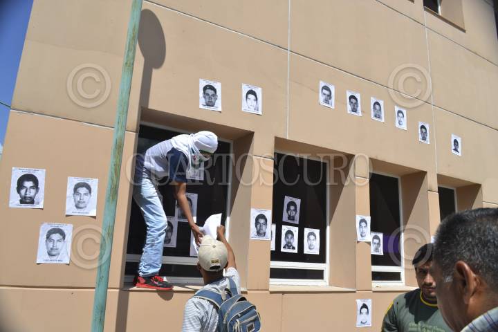 CHILPANCINGO, GUERRERO, 07SEPTIEMBRE2014.-Estudiantes de la Normal Raúl Isidro Burgos de Ayotzinapa y padres de familia de los desaparecidos, tomaron por espacio de una hora las instalaciones de la Procuraduría General de Justicia del Estado de Guerrero. En ese lance pegaron fotos de los 43 de los estudiantes desaparecidos en Iguala en ventanas, puertas, automóviles y oficinas del inmueble. El pasado 26 de septiembre, fueron atacados los normalistas con un saldo de 6 muertos, de los cuales cuatro eran normalistas y 17 heridos, así como un derrotistas muerto y el chófer de un autobús en que viajaban los estudiantes. FOTO: JOSÉ I. HERNÁNDEZ /CUARTOSCURO.COM