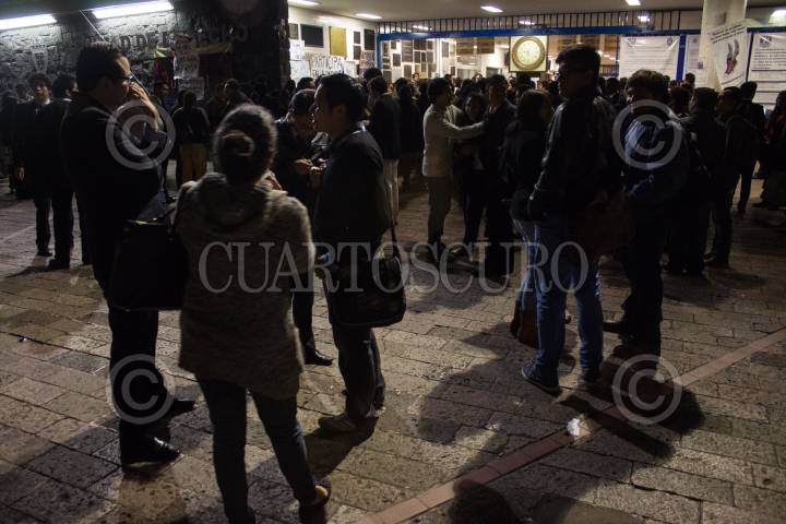 MEXICO, D.F., 21OCTUBRE2014.- Estudiantes de la Facultad de Derecho de la UNAM convocaron una asamblea esta noche para decidir en votación si se adherían o no al paro estudiantil convocado en apoyo a los 43 normalistas desaparecidos en Iguala, Guerrero, el pasado 26 de septiembre. En el conteo preliminar la votación contaba con 2273 votos a favor del paro hacia las 9:30 de la noche. En la imagen, estudiantes esperan los resultados del conteo. FOTO: DAVID POLO /CUARTOSCURO.COM