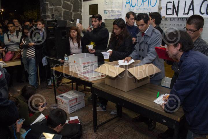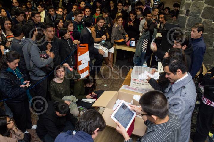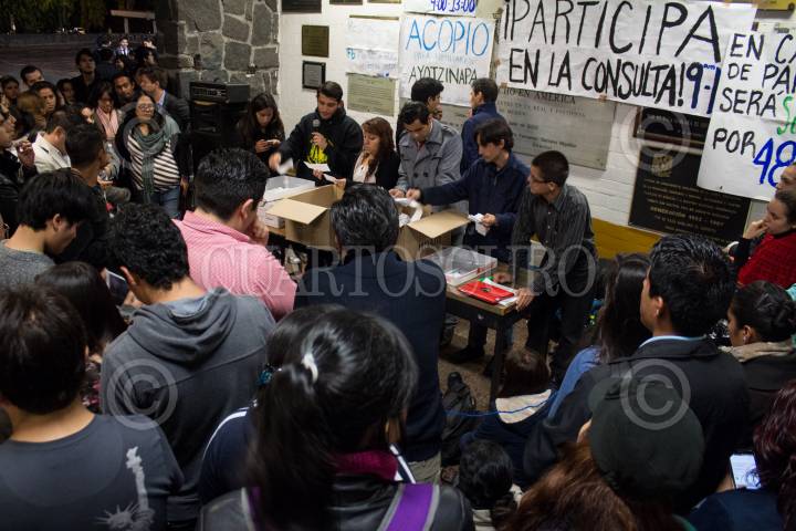 MEXICO, D.F., 21OCTUBRE2014.- Estudiantes de la Facultad de Derecho de la UNAM convocaron una asamblea esta noche para decidir en votación si se adherían o no al paro estudiantil convocado en apoyo a los 43 normalistas desaparecidos en Iguala, Guerrero, el pasado 26 de septiembre. En los resultados preliminires la votación contaba con 2273 votos a favor del paro hacia las 9:30 de la noche. En la imagen, los estudiantes durante el conteo de los votos. FOTO: DAVID POLO /CUARTOSCURO.COM