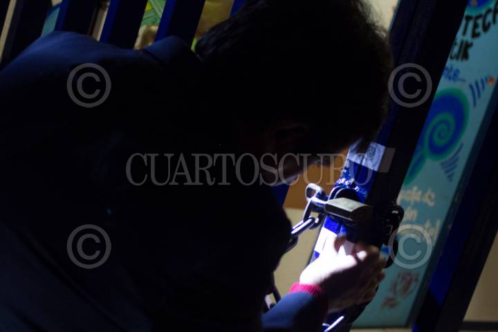 MEXICO, D.F., 21OCTUBRE2014.- Autoridades de la Facultad de Filosofía y Letras colocaron sellos en aulas y puertas y posteriormente entregaron las instalaciones del plantel a los alumnos para unirse al paro de 48 horas convocado en apoyo a las manifestaciones que exigen la aparición con vida de los 43 normalistas de Ayotzinapa, secuestrados en Iguala el pasado 26 de septiembre. En la imagen, un administrativo coloca un sello en una reja. FOTO: DAVID POLO /CUARTOSCURO.COM