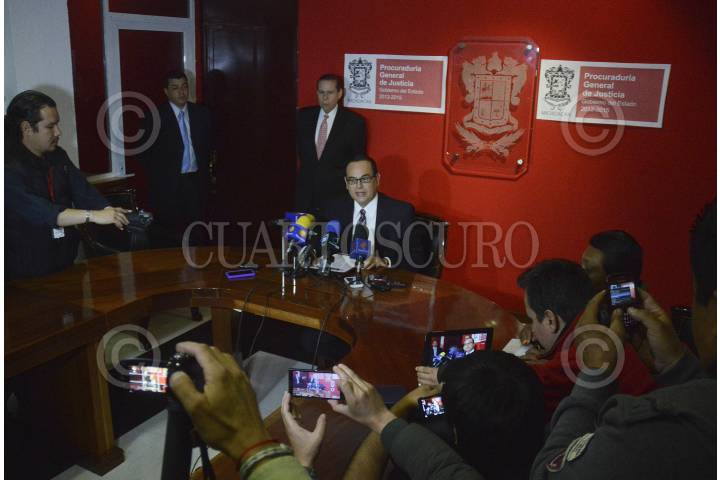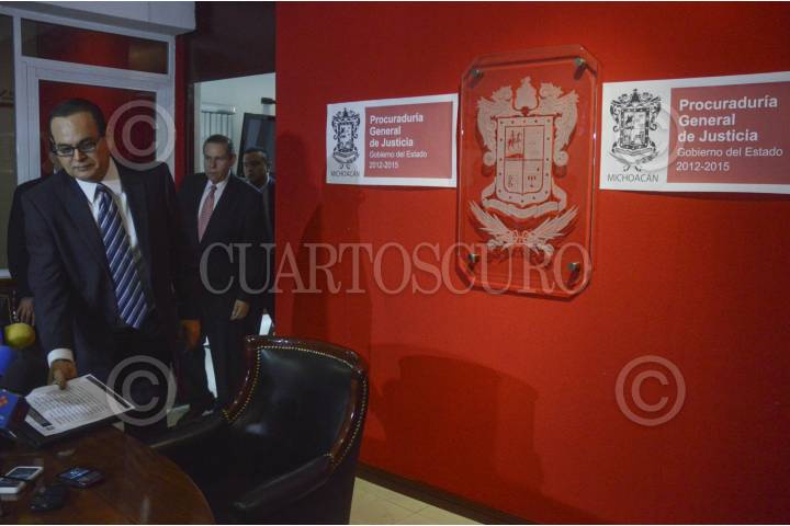 MORELIA, MICHOACÁN, 12MARZO2014.- Hipólito Mora permanece desde la tarde de ayer en las instalaciones de la Procuraduría Estatal tras haber sido aprehendido. Esta madrugada el procurador de Michoacán, José Martín Godoy Castro, dio lectura al comunicado oficial de la Procuraduría General de Justicia del Estado (PGJE) mientras el líder de los autodefensas rendía su declaración preparatoria en las mismas instalaciones. Con dicho documento se ratificó la detención del líder de La Ruana por la presunta coparticipación en el asesinato de Rafael Sánchez Moreno "El Pollo" y José Luis Torres Castañeda "El Tico", el pasado 8 de marzo. Ante la gravedad del delito las autoridades podrían proceder con otras órdenes de aprehensión que tendrían el carácter de inmediatas en el municipio de La Ruana, contra otros que resulten responsables del mismo delito que se le imputa a Mora Chávez. FOTO: ALAN ORTEGA /CUARTOSCURO.COM