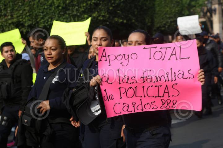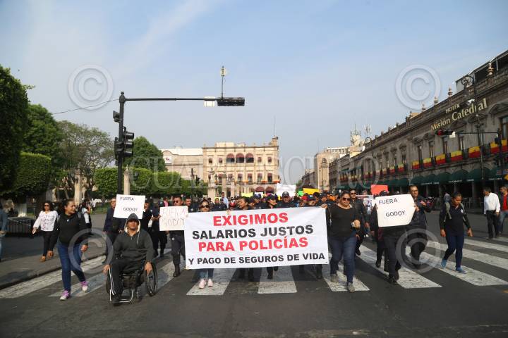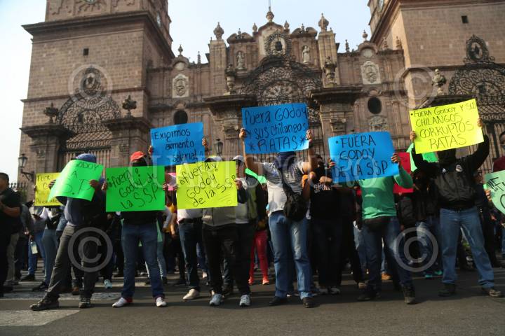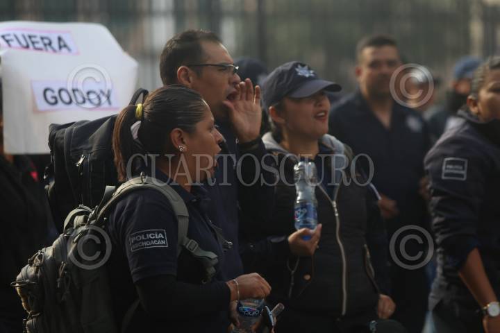 MORELIA, MICHOACÁN. 29ABRIL2019. Elementos de la policía Michoacán con el grito de: "¡Fuera Godoy, fuera chilangos!", marcharon de las diferentes regiones de la entidad, salieron del monumento a Lázaro Cárdenas y culminó a fuera de palacio de Gobierno. De forma simultánea también se manifestaron en las regiones de Uruapan, Paracho, Los Reyes, Tapalcatepec, Huetamo, Jiquilpan, Apatzingán, Gabriel Zamora, Taretan entre otros. Los elementos de seguridad, acusan a José Martin Godoy Castro titular de la Secretaria de Seguridad Pública SSP en el Estado, de pretender despedir y dar de baja de la corporación a más de mil 500 policías, con la justificación de que no tienen el examen de control y confianza, obligatorio para ser parte de la Secretaría de Seguridad como miembros de seguridad. Sin embargo, días atrás los policías argumentaron que la verdadera razón de los despidos, es el que se han negado a brindar protección al crimen organizado en negocios como el control de droga, huertas decomisadas a la delincuencia, piratería, minería, huachicoleo y otros. FOTO: JUAN JOSÉ ESTRADA SERAFÍN /CUARTOSCURO.COM