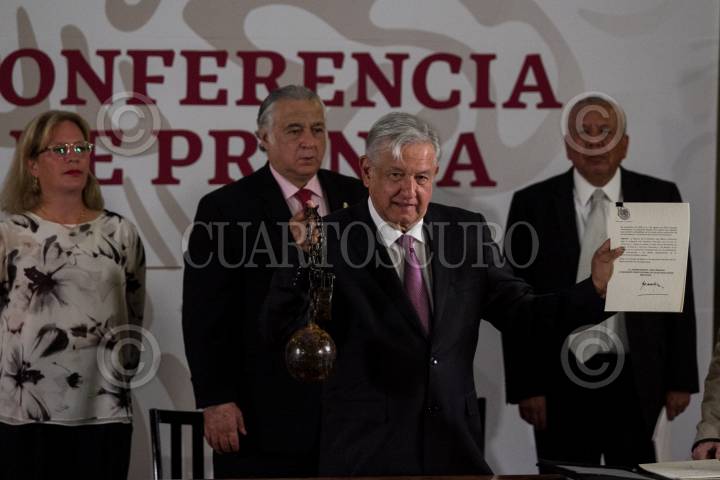 CIUDAD DE MÉXICO, 18FEBRERO2019.- Josefa González, titular de la Secretaria de Medio Ambiente; Miguel Torruco Márques, secretario de Turismo; Andrés Manuel López Obrador, presidente de México, y Francisco Garduño, comisionado del órgano administrativo desconcentrado de Prevención y Reinserción Social, durante la conferencia matutina del jefe del ejecutivo donde se firmo el decreto por el cual se aprueba el cierra de la prisión de las Islas Marías, para que esta sea transformada en un centro cultural y de educación ambiental. FOTO: GALO CAÑAS /CUARTOSCURO.COM