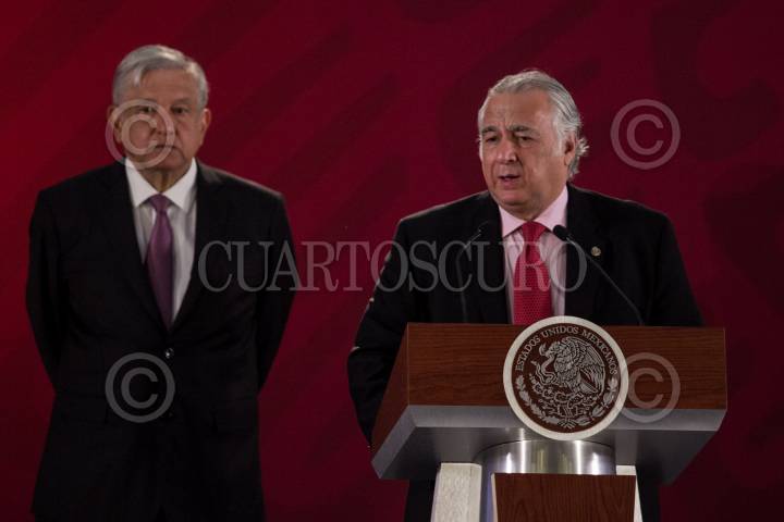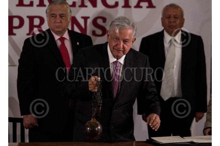 CIUDAD DE MÉXICO, 18FEBRERO2019.- Andrés Manuel López Obrador, presidente de México, y Miguel Torruco Márques, secretario de Turismo, durante la conferencia matutina del jefe del ejecutivo donde se firmo el decreto por el cual se aprueba el cierra de la prisión de las Islas Marías, para que esta sea transformada en un centro cultural y de educación ambiental. FOTO: GALO CAÑAS /CUARTOSCURO.COM