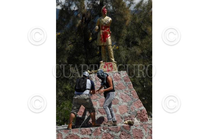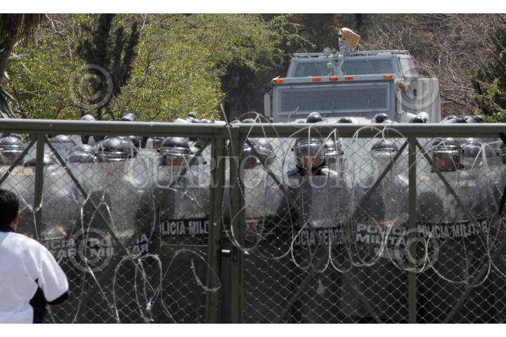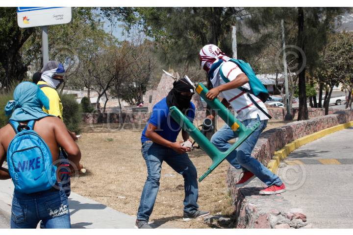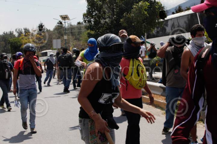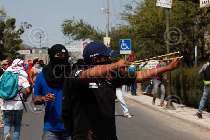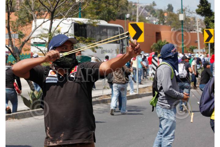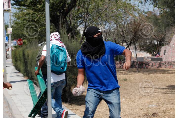 CHILPANCINGO, GUERRERO, 19FEBRERO2015.-Jóvenes encapuchados acudieron a la 35 zona militar, ubicada en el boulevard Vicente Guerrero, donde arrojaron piedras, cohetes e hicieron pintas en las barda perimetral con las leyendas “Ayotzinapa Vive” “Nos Faltan 43”, para exigir la presentación con vida de los 43 estudiantes desparecidos en Iguala. FOTO: JOSÉ I. HERNÁNDEZ / CUARTOSCURO.COM