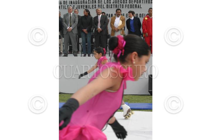 MEXICO, D.F. 21ENERO2005.- Nelson Vargas, titular de la Comisión Nacional del Deporte y Andrés Manuel López Obrador , jefe de gobierno de la ciudad de México, obsevan a un grupo de niñas que patinan durante la inauguración de la olimpiada deportiva de la ciudad de México, que se lleva a cabo en el deportivo Villa Olimpica. FOTO: Nelly Salas/CUARTOSCURO.COM