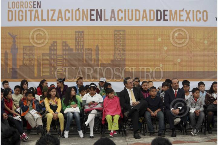 MÉXICO, D.F., 14NOVIEMBRE2012.- Marcelo Ebrard Casaubón, Jefe de Gobierno del Distrito Federal y Héctor Slim Seade, director general de Teléfonos de México, encabezaron el evento “Logros en digitalización en la ciudad de México Telmex" en presencia de niños y jóvenes estudiantes, que se realizó en el Parque México. FOTO: ADRIANA ÁLVAREZ /CUARTOSCURO.COM