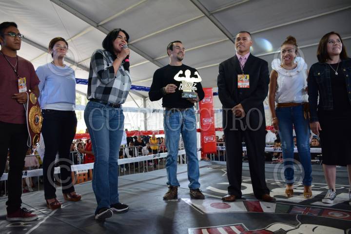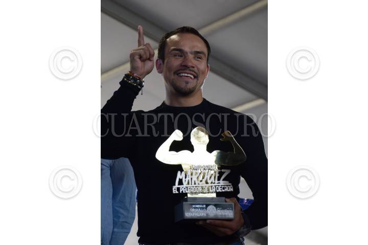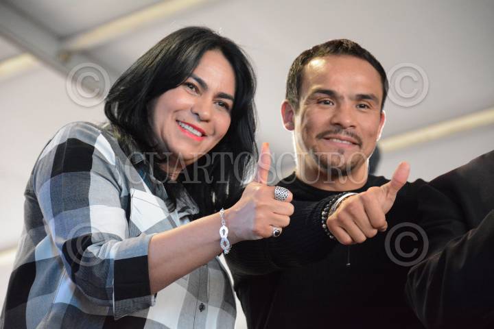 CIUDAD DE MÉXICO, 29ABRIL2017.- Dione Anguiana Flores, jefa delegacional en Iztapalapa; Juan Manuel Márquez, boxeador profesional mexicano, durante el “Homenaje Orgullo Iztapalapa”, lugar donde recibió un reconocimiento en honor a su éxitosa carrera. El evento contó con una magna función de box en la explanada de la Delegación. FOTO: MARIO JASSO /CUARTOSCURO.COM